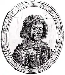 The surname Fanny appears nowhere in the very complete study of La Chambre des comptes de Paris ("Court of Finances of Paris") published by Count H. Coustant d'Yanville in 1875 (or for that matter in any other French document of the 17th century). In 1898, Viscount Oscar de Poli suggested that it must have been a transcription error and proposed reading it as Lamy.[24] An Antoine Lamy had actually been accepted as an auditor of finances on 2 September 1602, a year before Pierre de Maupeou, Espérance Bellanger's cousin and son-in-law of Denis Feydeau who was a witness to the marriage of Savinien's parents in 1612.[25] His wife, Catherine Vigor, associate of Vincent de Paul, would become President of the Confrérie de la Charité de Gentilly ("Charitable Fellowship of Gentilly") where the couple set up a mission in 1634.[26] She could well be the godmother of Catherine de Cyrano.