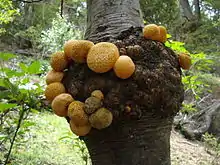 Cyttaria hariotii is an edible mushroom commonly called llao llao, llaullao and pan de indio. The fungus, found in Patagonia, southern Chile and Argentina, is parasitic on Nothofagus (Southern beech) trees. The fungus affects its hosts internally in its sap ducts; the tree defends itself by generating galls to bypass the sap blockages. The fungus expands out of the gall to other parts of the tree. That grows in the branches of the trees as if it was a fruit. This one is a great eatable mushroom of sweet flavor with which desserts, sweets and even icecreams are made.