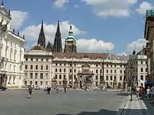 The examples of the late Baroque architecture (with Rococo elements) in Prague are the Archbishop's Palace or the Goltz-Kinsky Palace on the Old Town Square. In the style of Baroque Classicism the New Royal Palace of the Prague Castle was rebuilt by the Viennese architect Nicolo Pacassi in the second half of the 18th century.