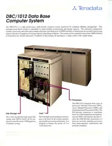 The DBC/1012 Data Base Computer was a database machine introduced by Teradata Corporation in 1984, as a back-end data base management system for mainframe computers.[1] The DBC/1012 harnessed multiple Intel microprocessors, each with its own dedicated disk drive, by interconnecting them with the Ynet switching network in a massively parallel processing system.[2][3] The DBC/1012 was designed to manage databases up to one terabyte (1,000,000,000,000 characters) in size; "1012" in the name refers to "10 to the power of 12".[4]