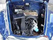 The 896 cc three cylinder engine provided at launch a claimed 34 bhp (25 kW). Following the company's pioneering work in the 1930s, the car had a front-wheel drive configuration which meant there was no bulky driveshaft running through the passenger cabin. The water cooled engine was installed longitudinally above the front wheels - the first appearance of the longitudinal "overhung" engine layout which DKW's successor - Audi - still uses to the present day, but the radiator was located not ahead of the engine but between the engine and the passenger cabin.