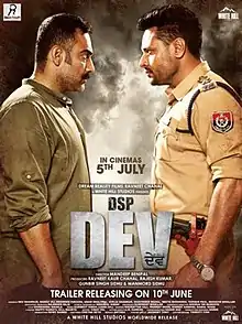 DSP Dev is an Indian Punjabi-language action film directed by Mandeep Benipal. Co-produced by Dreamreality Movies and White Hill Studios; it stars Dev Kharoud, Mehreen Pirzada, and Manav Vij in lead roles. Dev Kharoud plays an honest cop Dev Sher Gill.