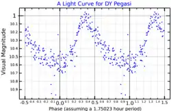 By 1972, it was widely regarded as a dwarf cepheid;[18] a Delta Scuti variable. However, some astronomers classed it as a short-period RRs Lyrae variable.[19] Photometric observations of DY Peg in 1975 by E. H. Geyer and M. Hoffman showed non-periodic changes to the light curve that suggested an overtone pulsation.[20] A frequency analysis of observations made by A. Masani and P. Broglia in 1953 strengthened the evidence that DY Peg is a double mode cepheid, showing a fundamental pulsation and a weaker first overtone with a period ratio of 0.764.[17] By 1982, similarities with SX Phoenicis had been found, with both showing comparable drifts in their beat periods.[21] Application of the Baade-Wesselink method provided a preliminary distance estimate to DY Peg of 820 ly (250 pc).[9]