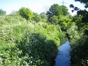 The brook emerges from the old route of the River Lea at the northeast corner of Lockwood Reservoir[2] and flows south, running alongside the members of the Lee Valley Reservoir Chain until it crosses the Lea Valley lines railway, just to the west of St. James Street railway station in Walthamstow.[2] For this section of its route it forms a part of the Lee Flood Relief Channel, constructed between 1947 and 1976. The flood channel turns west on the south side of the railway and the brook's original course splits off, continuing southeast under Lea Bridge Road until going underground at the site of the former Leyton Sewage Works.[lower-alpha 1][2] It briefly returns to the surface for a short stretch by Ruckholt Road, at which point it vanishes underground to eventually join the Waterworks River.[2] In the 19th century the brook also, at that point, joined a network of artificial channels that ran through the marshy Temple Mills area.[2]