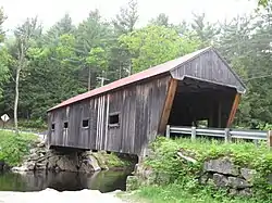 The Dalton Covered Bridge, also called the Dalton Bridge, is a historic covered bridge that carries Joppa Road over the Warner River in Warner, New Hampshire. Its name refers to a nearby resident (first "Mrs. Dalton", then "Widow Dalton") at the time of its construction. The bridge was built in 1853 by Joshua Sanborn, and its original abutments were built by George Sawyer and Webster Davis; all were local residents. The bridge has a span of 76 feet (23 m), with a total bridge length (including portals and roof) of 84 feet (26 m). The bridge is 17 feet (5.2 m) wide, with a road bed width of 14 feet (4.3 m), although guard rails have reduced its usable width to just under 13 feet (4.0 m).[2]