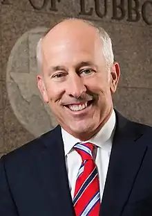 On May 5, 2018, Pope won a second two-year term as mayor with 78 percent of the vote over two little-known challengers.[2] In the campaign, Pope stressed public safety, including a new police facility, and planning for Lubbock's future growth.[3] The 2020 Mayoral election, in which Pope is standing, was scheduled to take place on May 2, however was postponed to November 3 after a proclamation from Texas Governor Greg Abbott to allow political subdivisions to delay voting.[4] Lubbock native Stephen Sanders is challenging Pope. Sanders had run against Pope before as a write in candidate during the 2018 mayoral election.[5]