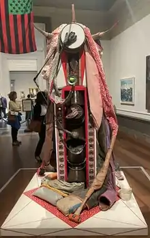 He was described as the "breakout star" or highlight of the 2019 Whitney Biennial by multiple reviewers,[6][7][8][9] with the New York Times writing that his sculpture Maria Maria exemplified the pieces in the Biennial that "reassert the power of spirituality."[10] Critic Holland Cotter elaborated on the sculpture, explaining how Lind-Ramos "creat[ed] from wood, beads, coconuts and a blue FEMA tarp, a figure that is both the Virgin Mary and personification of the hurricane that devastated the island in 2017 ... the piece looks presidingly majestic."[10][11]