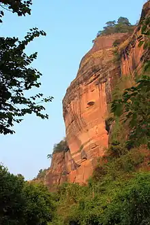 Danxia landforms cover several provinces in southeast China. Taining County, Fujian Province, has very good examples of "young" danxia landforms wherein deep, narrow valleys have been formed. As the landform gets older, valleys widen and one gets isolated towers and ridges.The danxia landform is named after Mount Danxia, one of the most famous examples of the danxia landform. A very peculiar feature of danxia landscape is the development of numerous caves of various sizes and shapes. The caves tend to be shallow and isolated, unlike true karst terrain where caves tend to form deep, interconnecting networks. In 2010, several danxia landscapes in southern China, with a general name of "China Danxia", were inscribed as a World Heritage Site.[5] The six inscribed danxia landform areas are: Mount Langshan and Mount Wanfo (Hunan Province), Mount Danxia (Guangdong Province), Taining and Mount Guanzhi (Fujian Province), Mount Longhu and Guifeng (Jiangxi Province), Fangyan, Mount Jianglang (Zhejiang Province), and Mount Chishui (Guizhou Province). The total core area of 6 regions above is 73945 ha (182,722 acres), and the total buffer area is 65446 ha (161,720 acres).[1] Other notable danxia areas, such as Zhangye Danxia National Geological Park, are not included in the World Heritage Site.