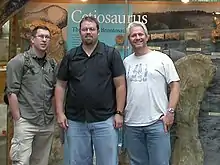 In 2004 Naish and colleagues described a giant Isle of Wight sauropod dinosaur that appears closely related to the North American brachiosaurid Sauroposeidon, and informally referred to as Angloposeidon.[21] Prior to the 2006 description of Turiasaurus from Spain, this was the largest dinosaur reported from Europe. In 2005 he coauthored the description of the new Cretaceous turtle Araripemys arturi,[22] and in 2006 he and David Martill published a revision of the South American crested pterosaurs Tupuxuara and Thalassodromeus.[23] During 2007 and 2008, Naish and Martill published a major revision of British dinosaurs;[24][25] Naish also published work with Barbara Sánchez-Hernández and Michael J. Benton on the vertebrate fossils of Galve in Spain. The Galve fossils are significant in including istiodactylid pterosaurs, heterodontosaurids and spinosaurines. In 2007, Naish co-authored the description of the new sauropod Xenoposeidon with fellow Portsmouth-based palaeontologist Mike P. Taylor.[2] In 2008 he published an evaluation of azhdarchid pterosaurs with Mark Witton, in which they argued that azhdarchids were stork- or ground hornbill-like generalists, foraging in diverse environments for small animals and carrion.[5] Along with his colleagues Mike Taylor and Matt Wedel he published a paper on sauropod neck posture in 2008.[26] In 2010 Naish published a paper on the theoretical flotation abilities of giraffes.[27] In 2011 Hone, Naish and Cuthill published a paper on mutual selection in dinosaurs and pterosaurs[28] In 2013, Naish described Vectidraco daisymorrisae, a small azhdarchoid pterosaur from the Isle of Wight.[29] Also in 2013 Naish and Witton published a follow-up to their 2008 paper on terrestrial stalking in azhdarchid pterosaurs.[6] In 2015 Naish and colleagues published on a new, as yet unnamed, Transylvanian pterosaur taxon.[30]