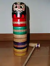Many children's games make mention of Daruma. In Japanese, snowmen are called "Yukidaruma" (Japanese: 雪だるま), literally snow daruma. Possibly because the shape is related to Daruma, they usually only have two sections instead of three.[24] Darumasan ga Koronda is an equivalent to the American Red light/Green light game. Daruma Otoshi (だるま落とし) is a traditional game played with a daruma doll in five pieces, usually in the colors of the rainbow, from top to bottom: head – a man's face, blue, green, yellow, red. The game is played by using a small hammer to hit each of the colored pieces, from bottom to the top, without letting the pieces fall during the game.