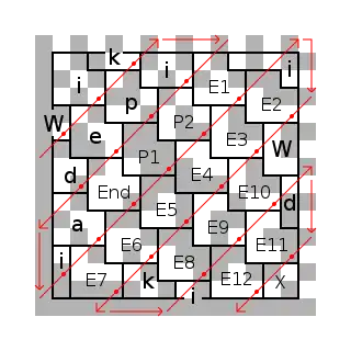 The diagrams below illustrate the placement of the message data within a Data Matrix symbol. The message is "Wikipedia", and it is arranged in a somewhat complicated diagonal pattern starting near the upper-left corner. Some characters are split in two pieces, such as the initial W, and the third 'i' is in "corner pattern 2" rather than the usual L-shaped arrangement. Also shown are the end-of-message code (marked End), the padding (P) and error correction (E) bytes, and four modules of unused space (X).