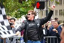 Hasselhoff waving the checkered flag at the 2008 Gumball 3000