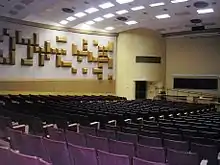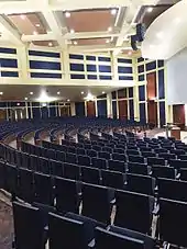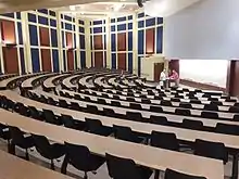 The hall housed the largest auditorium on campus which originally seated 998 people and was generally divided into two large lecture classes.[11] Four of the first floor class rooms were also redesigned in 2013 in order to create better faculty-student interaction and a more collaborative learning space.[12][13] A $7.4 million renovation of David Lawrence Hall was undertaken in 2014. The main lecture hall was split into two separate lecture halls which were reopened in 2015 with improved acoustics and capacities of 571 and 332 each.[14] Three new 50-seat classrooms were added to the second floor mezzanine, and the main lobby was overhauled.[15]