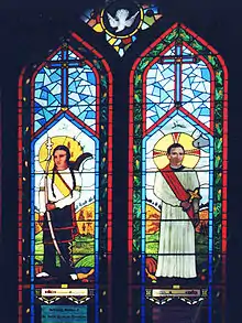 In 1985 the Episcopal Church designated Oakerhater as a saint, thanks in part to years of work and research by Lois Carter Clark, a Muscogee Creek scholar.[11] On September 1, 1986, the first feast was held in his honor at the Washington National Cathedral in Washington, D.C.; his descendants and delegations from Oklahoma were invited to the celebration. In 2000 the Saint George Church of Dayton, Ohio dedicated a large stained glass window in its chapel depicting Oakerhater, and a smaller window bearing his glyph signature.[10]