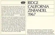 In 1964, he produced the first Ridge Zinfandel, from a small nineteenth-century vineyard on the nearby Picchetti ranch.[7] This was followed in 1966 by the first Geyserville Zinfandel.