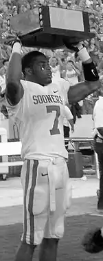 In the 2009 season, the backfield was largely dominated by the duo of Murray and Chris Brown.[28] In the second game of the Sooners' 2009 season, Murray rushed for 101 yards and two touchdowns in the 64–0 victory over Idaho State.[29] On October 10, against Baylor, he had 24 carries for 107 yards in the 33–7 victory.[30] In the next game, against #3 Texas, Murray had eight receptions for 116 yards in the 16–13 loss.[31] In the following game, he had 15 carries for 62 yards and two touchdowns to go along with four receptions for 28 yards and a touchdown in the 42–30 victory over Kansas State.[32] On November 14, against Texas A&M, Murray had a stellar performance with 80 rushing yards to go along with five receptions for 140 yards and two touchdowns in the 65–10 victory.[33] On November 28, against #11 Oklahoma State, he rushed for 72 yards and two touchdowns in the 27–0 victory.[34] In the 2009 Sun Bowl against #19 Stanford, Murray had 20 carries for 27 yards and the final go-ahead touchdown in the 31–27 victory.[35]