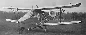 There was no fuselage in the conventional sense, rather a nacelle for pilot and engine and a number of rearward booms to carry the tail.[1][2] The nacelle was flat sided and just wide enough to accommodate the pilot, who sat under flexible glazing[3] below the leading edge of the upper wing. It was a steel-framed, fabric-covered structure.[1] The nose of the aircraft was easily removable to give access to the rear of the instrument panel.[3] Behind the pilot was a small baggage hold, externally accessed and the 40 hp (30 kW) Praga B2 two-cylinder engine was at the rear of the nacelle, driving a two-bladed pusher propeller with its boss only just below the upper wing.[1] Two horizontal steel booms converged from that wing, just inboard of the interplane struts to the tips of the tailplane. Three more beams spread out from the base of the nacelle upwards, the outer pair joining those from the upper wing forming the tailplane extremities and the central one supporting the rudder and inner tailplane. Thus the tailplane had angular tips and a straight leading edge, and the elevators had a triangular cut out for rudder movement. Because of the short length of these booms the fin and rudder, both of which extended above and below the tailplane had to be generous in area. The tail surfaces were fabric covered over a wooden structure.[1] The main undercarriage was mounted on splayed, sprung and faired legs attached to the rear of the nacelle plus vertical long stroke shock absorbers.[1] The steerable nosewheel had the same diameter as the main wheels.