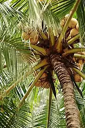 Coconut fruit come from the coconut palm (Cocos nucifera), which can grow up to 30 m (100 ft) tall, with pinnate leaves 4–6 m (13–20 ft) long and pinnae 60–90 cm (2–3 ft) long. Older leaves will break away cleanly from the tree leaving a smooth trunk.[7] While a mature and thriving tree can yield up to 75 fruits per year, it is more common to get fewer than 30.[8] A full-sized coconut weighs about 1.44 kg (3 lb 3 oz).[9] Coconut palms are cultivated in more than 80 countries, with a total production of 61 million tonnes per year.[10]