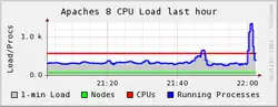 Jackson's death was first reported by the Los Angeles-based celebrity news website TMZ. Doctors at Ronald Reagan UCLA Medical Center pronounced Jackson dead at 2:26 p.m., and TMZ announced the death 18 minutes later.[23] The Los Angeles Times confirmed the report at 2:51 p.m. PDT (5:51 p.m. EDT).[92] The news spread quickly online, causing websites to slow down and crash from user overload. TMZ and the Los Angeles Times suffered outages.[93] Google initially believed that the millions of search requests meant their search engine was under DDoS attack, and blocked searches related to Michael Jackson for 30 minutes. Twitter reported a crash, as did Wikipedia at 3:15 p.m. PDT (22:15 UTC).[94] The Wikimedia Foundation reported nearly a million visitors to Jackson's biography within one hour, probably the most visitors in a one-hour period to any article in Wikipedia's history up to that point.[95] AOL Instant Messenger collapsed for 40 minutes.[96] Around 15% of Twitter posts (5,000 tweets per minute) mentioned Jackson after the news broke,[97][98] compared to the 5% recalled as having mentioned the Iranian elections or the flu pandemic that had made headlines earlier in the year.[98] Overall, web traffic ranged from 11% to at least 20% higher than normal.[97][99] MTV and BET aired marathons of Jackson's music videos.[100]