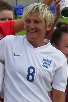 Bampton hit the winning goal in Denmark as England qualified for the 1984 European Competition for Women's Football final.[13] In the second leg of the final at Kenilworth Road, Bampton scored in England's penalty shootout defeat to Sweden.[14] In 1985 she became the England captain following the retirement of Carol Thomas, then England's most capped player and still the second longest serving captain. In 1991 she was injured and replaced as captain by Gillian Coultard.[15] In 1995 new manager Ted Copeland restored her as captain,[16] and she led the Three Lionesses into their first ever FIFA Women's World Cup appearance that year.[17] Bampton recalled: "It was difficult, especially as Gill and I were roommates and at that point the England squad was split. A lot of people wanted Clare Taylor to be captain, but it was something I'd always wanted to do and so I just enjoyed it."[18] She retained the captaincy for England's failed 1997 UEFA Women's Championship qualification campaign.[19] In May 1997 Bampton made her final England appearance in a 6–0 friendly defeat to United States in Portland.[20] She won 95 caps for England, scoring three goals altogether.[2]