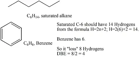 For hydrocarbons, the DBE (or IHD) tells us the number of rings and/or extra bonds in a non-saturated structure, which equals to the number of hydrogen pairs that are required to make the structure saturated, simply because joining two elements to form a ring or adding one extra bond in a structure reduces the need for two H's. For non-hydrocarbons, the elements in a pair can include any elements in the lithium family and the fluorine family in the periodic table, not necessary all H's.