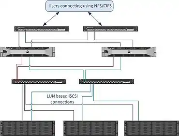 The underlying software architecture of FluidFS employs a Linux-based symmetric clustering model with distributed metadata, native load balancing, flexible caching capabilities and other features. Its scalability is not limited by volume size as with traditional file systems, and supports scaling up (adding capacity to the system) and by scaling out (adding nodes, or performance, to the system). FluidFS operates across a symmetric cluster of purpose-built NAS controllers (housed in pairs within a 2U appliance), which interface over a fabric to shared back-end storage via iSCSI or Fibre Channel storage area networks.