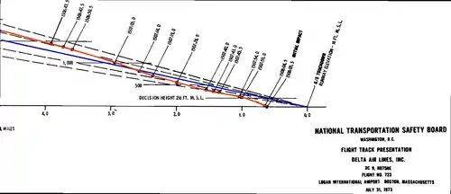 The aircraft, flying at 3,000 feet (910 m), had been vectored by Boston's approach control to intercept the final approach course to the ILS runway 4R approach at a 45 degree angle,[lower-alpha 1] about 2 nautical miles (3.7 km; 2.3 mi) outside the outer marker.[4] As it was later revealed, the controller was busy handling a potential collision conflict between two other aircraft, and therefore neglected to clear Flight 723 for the approach. The flight crew had to ask the controller for approach clearance, which was immediately given, but by that time—more than a minute after the intercept vector had been issued—they were high and fast and almost over the outer marker. The flight crew subsequently failed to stabilize the aircraft's descent rate and airspeed, descended below the glideslope and drifted left of the localizer course, hitting a seawall about 165 feet (50 m) to the right of the extended runway centerline, about 3,000 feet (910 m) short of the runway's displaced threshold. The aircraft was destroyed, killing 87 of its 89 occupants. One of the two survivors died after two hours, and the other, Leopold Chouinard, died of burn injuries on December 11, 1973;[5] Chouinard is not listed by the National Transportation Safety Board (NTSB) as an official Delta 723 fatality due to requirements in the Code of Federal Regulations which, in 1973, defined a crash fatality as taking place within 7 days of an accident;[6] the rule was subsequently changed in 2018, such that death must occur within 30 days of a crash.[7]