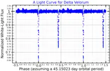In 2000 it was announced that the inner components Aa and Ab form an eclipsing binary, having an orbital period of 45.15 days and an eccentricity of 0.230.[10] The semi-major axis as their orbit corresponds to a mean separation of 90.61 AU.[22] Delta Velorum is the brightest-known eclipsing binary, although Algol has a deeper minimum and is easier to observe visually. Observations of variability in the Delta Velorum system were made independently by ground-based astronomers and the Galileo spaceprobe at Jupiter.[21] The inner pair were resolved using interferometry in 2007, and then using NACO adaptive optics with the Very Large Telescope. Photometry of the components of δ Velorum A gives apparent visual magnitudes of 2.33 and 3.44.[3] The precise orbits allow a dynamical parallax of 39.8±0.4 mas to be derived, representing a distance of 25.1 parsecs.[7]