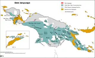 Dem (Lem, Ndem) is a divergent Papuan language of West New Guinea. Although Palmer (2018) leaves it unclassified,[2] it was tentatively included in the Trans–New Guinea family in the classification of Malcolm Ross (2005), and Timothy Usher ties it most closely to Amung.[3]