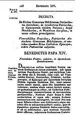Demandatam coelitus humilitati nostrae is an apostolic constitution promulgated by Pope Benedict XIV on December 24, 1743, about the Melkite Greek Catholic Church. It is addressed to the Patriarch of Antioch Cyril VI Tanas and to all Melkite bishops under his jurisdiction, and is generally not considered ex cathedra. The subject of this apostolic constitution is the full preservation of the Byzantine Rite in the Melkite Greek Catholic Church.[1]