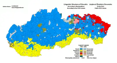 Slovak (official) 81.77%, Hungarian 8.48%, Roma 1.84%, Rusyn 0.71%, other or unspecified 7.2% (2021 census)