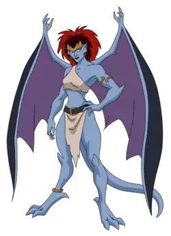 Demona (lit. '"She-Demon"'), voiced by Marina Sirtis, is a fictional character and one of the primary antagonists of the Disney animated television series Gargoyles.[1][2][3] Demona was once Goliath's mate and was part of their 10th century AD castle's Wyvern Clan. She is consumed by a hatred of humanity[4] and has attempted several times to destroy it.