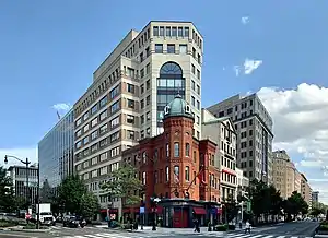 To make the old and new buildings architecturally compatible, bricks were incorporated into the design of the new building's façade.[15] Concrete floors were poured into the 12,000 sq ft (1,115 sq m) corner buildseting, and once the new building was completed, floor joists were replaced with steel beams. The roof of the corner building was converted into a terrace for the fifth floor of the new building. The sixth through twelfth floors of the new building rise above and behind the corner building and feature a beveled tower with a six-story arched window. On the M Street side, the building's eleventh and twelfth floors are set back 20 ft (6.1 m) from the first ten floors.[18][20] A brick four-story historicist section was built between the two buildings to blend the corner building's cornice line.[21]