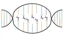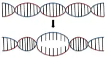 The non-covalent interactions between antiparallel strands in DNA can be broken in order to "open" the double helix when biologically important mechanisms such as DNA replication, transcription, DNA repair or protein binding are set to occur.[19] The area of partially separated DNA is known as the denaturation bubble, which can be more specifically defined as the opening of a DNA double helix through the coordinated separation of base pairs.[19]