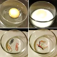 A classic example of denaturing in proteins comes from egg whites, which are typically largely egg albumins in water. Fresh from the eggs, egg whites are transparent and liquid. Cooking the thermally unstable whites turns them opaque, forming an interconnected solid mass.[7] The same transformation can be effected with a denaturing chemical. Pouring egg whites into a beaker of acetone will also turn egg whites translucent and solid. The skin that forms on curdled milk is another common example of denatured protein. The cold appetizer known as ceviche is prepared by chemically "cooking" raw fish and shellfish in an acidic citrus marinade, without heat.[8]