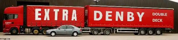 The Denby Eco-Link, dubbed the super lorry by the mainstream media, is a commercial vehicle designed and built by Denby Transport of the United Kingdom. The Eco-Link is a 60 tonne fully laden, 25.25m long, 8 axle B-Train (or B-Double) type of semi-trailer truck, in which a tractor unit pulls two semi-trailers, using fifth wheel couplings on both trailers. As one prototype of the UK Longer Heavier Vehicle (LHV) vehicle definition, which are longer and heavier than normal Large Goods Vehicles (LGVs, British English: lorries), it is not currently permitted to be used in the UK. As of 2009, the largest ordinary lorries in the UK have 6 axles and a maximum laden weight of 44 tonnes, and can be 16.5m long as single trailer semi-trailer trucks (British English: articulated lorries), or 18.75m as drawbar lorries.