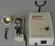 A dental curing light is a piece of dental equipment that is used for polymerization of light-cure resin-based composites.[1] It can be used on several different dental materials that are curable by light. The light used falls under the visible blue light spectrum. This light is delivered over a range of wavelengths and varies for each type of device. There are four basic types of dental curing light sources: tungsten halogen, light-emitting diodes (LED), plasma arcs, and lasers. The two most common are halogen and LEDs.