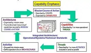 See the diagram for a depiction of the Capabilities Emphasis, as tied in with mission/course of action, threads, activities, and architectures.