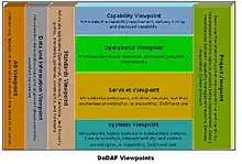 The Department of Defense Architecture Framework (DoDAF) is an architecture framework for the United States Department of Defense (DoD) that provides visualization infrastructure for specific stakeholders concerns through viewpoints organized by various views. These views are artifacts for visualizing, understanding, and assimilating the broad scope and complexities of an architecture description through tabular, structural, behavioral, ontological, pictorial, temporal, graphical, probabilistic, or alternative conceptual means. The current release is DoDAF 2.02.