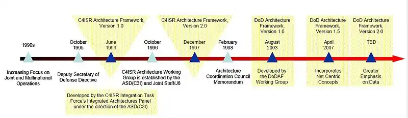 In August 2003 the DoDAF v1.0 was released, which restructured the C4ISR Framework v2.0 to offer guidance, product descriptions, and supplementary information in two volumes and a Desk Book. It broadened the applicability of architecture tenets and practices to all Mission Areas rather than just the C4ISR community. This document addressed usage, integrated architectures, DoD and Federal policies, value of architectures, architecture measures, DoD decision support processes, development techniques, analytical techniques, and the CADM v1.01, and moved towards a repository-based approach by placing emphasis on architecture data elements that comprise architecture products.[1] In February 2004 the documentation of Version 1.0 was released with volume "I: Definitions and Guidelines", "II: Product Descriptions" and a "Deskbook". In April 2007 the Version 1.5 was released with a documentation of "Definitions and Guidelines", "Product Descriptions" and "Architecture Data Description".