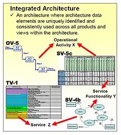 The DODAF 2.0 Architects Guide [14] repeated DOD Instruction 4630.8 definition of an integrated architecture as "An architecture consisting of multiple views facilitating integration and promoting interoperability across capabilities and among integrated architectures. For the purposes of architecture development, the term integrated means that data required in more than one of the architectural models is commonly defined and understood across those models. Integrated architectures are a property or design principle for architectures at all levels: Capability,Component, Solution, and Enterprise (in the context of the DoD Enterprise Architecture (EA) being a federation [of] architectures). In simpler terms, integration is seen in the connection from items common among architecture products, where items shown in one architecture product (such as sites used or systems interfaced or services provided) should have the identical number, name, and meaning appear in related architecture product views."