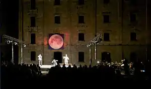 Other performances have been given by Ravinia Festival at Temple Shalom in Chicago (2005), City Opera of Vancouver (2009), Long Beach Opera (2009), Boston Lyric Opera (2011), Dioneo Opera (Grimeborn, London, 2011), and English Touring Opera in London and locations throughout England (2012).[4][15] It was presented in Denver, Colorado, by Central City Opera, in collaboration with other Denver organizations, in January 2013.[16] The New Millennium Orchestra, in collaboration with the City of Chicago's Department of Cultural Affairs, presented the opera in March 2013 on the Pritzker stage of Millennium Park.[17] It was performed in Melbourne at Monash University's Caulfield campus in July 2012 by IOpera,[18] and by Perth Hebrew Congregation, Perth, Western Australia, in June 2014, by Lostandfound Opera[19] Juilliard Opera Center performed the work (in a double bill with Poulenc's Les mamelles de Tirésias) in November 2015.[20][21] The Dutch M31 Foundation made a small documentary with all the old cast members of the first performance and performed the work in 2016 with a new cast in several theatres in the Netherlands.[22] In October 2020, the Atlanta Opera produced socially distanced performances of the work outdoors in a circus tent.[23]