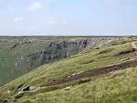 The terrain of Derbyshire mostly consists of uplands to the north and centre of the county, and lowlands to the south and east. The southern foothills and uplands of the Pennines extend from the north of the Trent Valley[18] throughout the Peak District and into the north of the county, reaching the county's highest point at Kinder Scout.[19] The terrain is relatively low-lying across the lower Dove Valley, from the Trent Valley and southwards, and near its eastern borders with Nottinghamshire and Leicestershire. The main rivers in the county are the River Derwent and the River Dove which both join the River Trent in the south. The River Derwent rises in the moorland of Bleaklow and flows throughout the Peak District and county for the majority of its course, while the River Dove rises in Axe Edge Moor and forms a boundary between Derbyshire and Staffordshire for most of its length.