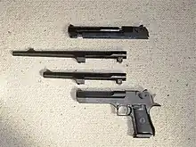 Switching a Desert Eagle to another chambering requires only that the correct barrel, bolt assembly, and magazine be installed. Thus, a conversion to fire other cartridges can be quickly accomplished. The rim diameter of the .50 AE (Action Express) is the same as the .44 Remington Magnum cartridge, consequently, only a barrel and magazine change is required to convert a .44 Desert Eagle to the larger, more powerful, .50 AE round.[4][5] The most popular barrel length is 6 in (152 mm), although a 10 in (254 mm) barrel is available. The Mark XIX barrels are machined with integral scope mounting bases, simplifying the process of adding a pistol scope.