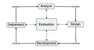 A similar approach is the ADDIE Model of instructional design, a framework of generic processes used by instructional designers and training developers.[9] It represents a descriptive guideline with five distinct phases: