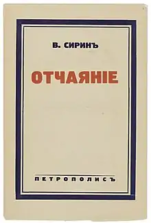Despair (Russian: Отчаяние, or Otchayanie) is the seventh novel by Vladimir Nabokov, originally published in Russian, serially in the politicized literary journal Sovremennye zapiski during 1934. It was then published as a book in 1936, and translated to English by the author in 1937. Most copies of the 1937 English edition were destroyed by German bombs during World War II; only a few copies remain. Nabokov published a second English translation in 1965; this is now the only English translation in print.