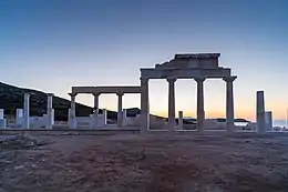 Although presently uninhabited, there are significant indications that in prehistoric and ancient times the island - due to its central position among the Cyclades and the large Despotiko Bay (between the island and Antiparos) providing safe anchorage[7] - played an important role in maritime communication routes.[8] Currently, excavations are taking place in the northwest part of the island and so far the findings are of great importance. The excavations proved the existence of an important late Archaic sanctuary with abundant objects indicating links to mainland Greece, the Eastern Mediterranean and even to Northern Africa, as well as the continued use of this area in the Classical, Hellenistic, Roman and Frankish periods.[6][9] 2015 excavations at the Archaic (6th C BC) sanctuary site on an Aegean Sea islet revealed new evidence about its size and organization. The sanctuary seems to have been devoted to Apollo. Archaeologists discovered an ornate façade of a structure measuring 35 meters by 15 meters, suggesting that the sanctuary was extended and rebuilt several times during the Classical and Hellenistic periods. A large, four-room building on the site's west section featured a large stone altar in one of the rooms as well as pottery fragments bearing inscriptions with Apollo's name. A long wall, stretching from what would have been the islet's ancient port to the site of the sanctuary, was also revealed.[10] Some of the artefacts from the excavations are exhibited in the archaeological museum in Parikia, the capital of the nearby island of Paros, along with other important antiquities from the region. Some glimpses of the early modern and modern history of Despotiko might be reconstructed from historic topographic maps[11][12] and descriptions of travellers from that period.[3] The island, under the name Prepesinthus, is also noted by ancient geographers Strabo[13] and Pliny the Elder.[14]