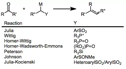 A wide variety of carbonyl olefination methods that are direct alternative to the Julia olefination are known: the Wittig reaction,[25] the Horner-Wadsworth-Emmons reaction,[26] Peterson olefination,[27] and others. The primary advantage of Julia olefination is that the sulfone precursors are sometimes more readily available and easier to purify than the corresponding phosphorus- or silicon-containing compounds. Additionally, a variety of methods to synthesize sulfones exist.[28] Nonetheless, the sometimes limited stereoselectivity (and in particular, the difficulty of accessing (Z) -alkenes) of the Julia reaction can be problematic. Many alternative methods for olefination, including the Peterson reaction,[27] do not have this issue.