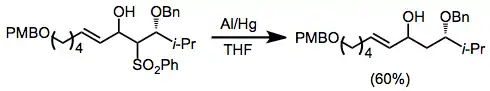 Alkyl sulfones may be reduced with sodium or lithium in liquid ammonia;[11] however, the strongly basic conditions of these dissolving metal reductions represent a significant disadvantage. In alcoholic solvents, magnesium metal and a catalytic amount of mercury(II) chloride may be used.[12] A wide variety of functional groups are unaffected by these conditions, including many that are transformed by dissolving metal reductions. Reductive desulfonylation with these reagents does not occur in reactions of β-hydroxy sulfones, due to the poor leaving group ability of the hydroxyl group.[13]