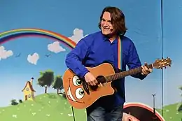 Jöcker was awarded nine Gold records and seven Platinum records from the Bundesverband Musikindustrie for more than 13 million recordings sold.[4] He has toured internationally as "Botschafter des deutschen Kinderliedes" (ambassador of German children's songs) by the Goethe Institute.[1] He met Shimon Peres in 2005, and became ambassador of the Peres Foundation.[5] He composed for broadcast for children and audio plays. Jöcker founded the publishing house Menschenkinder Verlag in 1987, which published from 1980 to 2017 around 500 recordings and songbooks for children and families. From 2015, marketing and distribution have been performed by SONY.[6] Jöcker has been a member of the ecumenical group of authors and composers Werkgemeinschaft Musik, now Textautoren- und Komponistengruppe TAKT.[1]